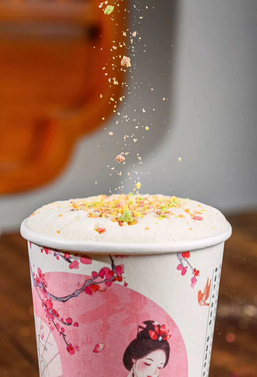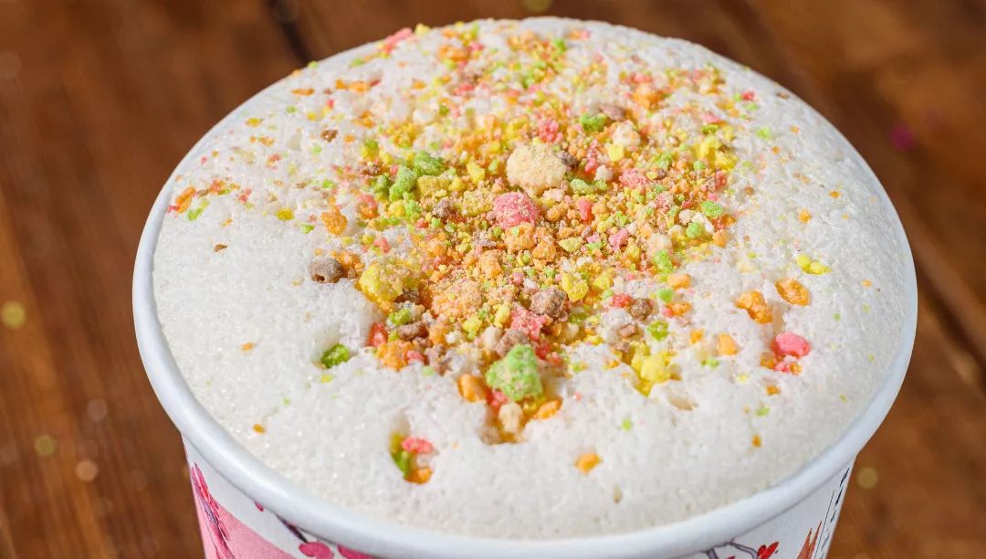 淡彩的马卡龙碎绵软甜蜜,散落在奶沫上,诱人可口。马卡龙碎的甜蜜相伴奶沫的温柔,在舌上绽放,底下的鲜奶茶流淌过喉咙,百喝不腻。