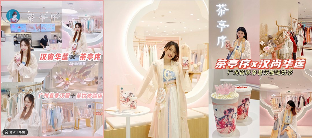 为打造差异化,茶亭序抓住了当下国风潮流和汉服复兴的风口,首次提出茶+汉服的新的商业模式,并选择了国内第一汉服品牌汉尚华莲进行合作。