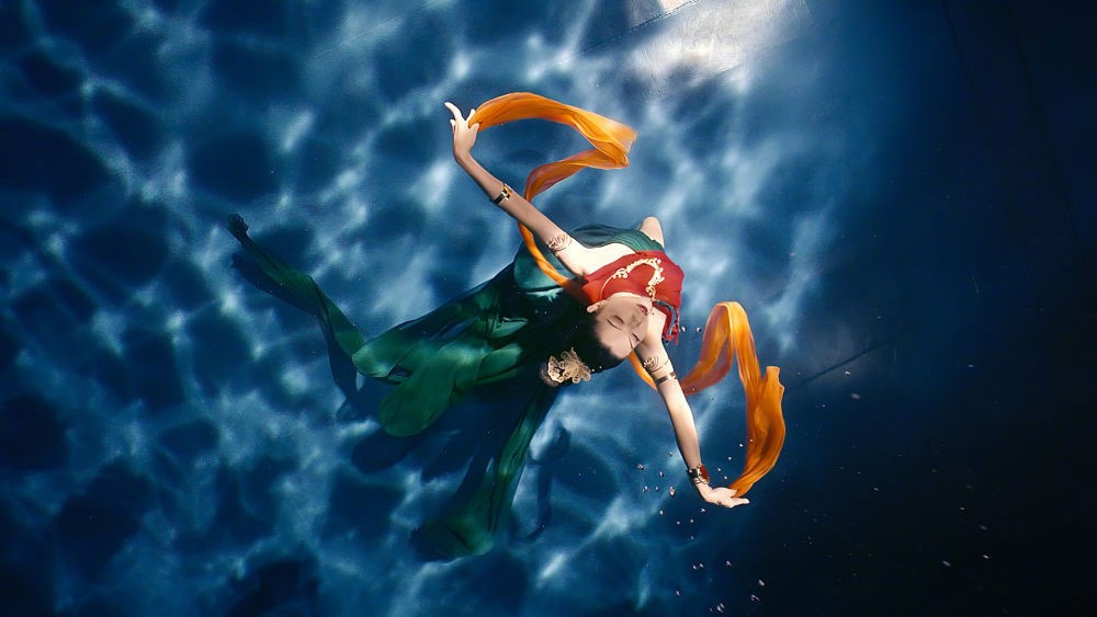 这段叫做《祈》的舞蹈,是由真实的演员潜入深水中起舞,工作人员在水下拍摄,辅以后期剪辑加速,最终呈现了飞天凌空的视觉效果,“翩若惊鸿,婉若游龙。”表达端午临水敬洛神祈福之意。