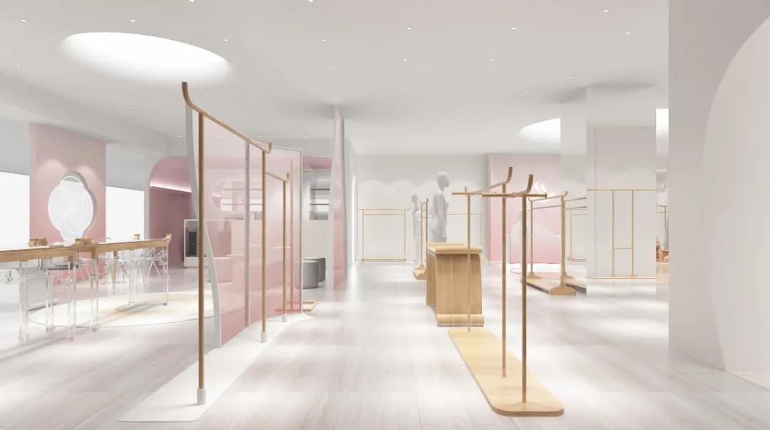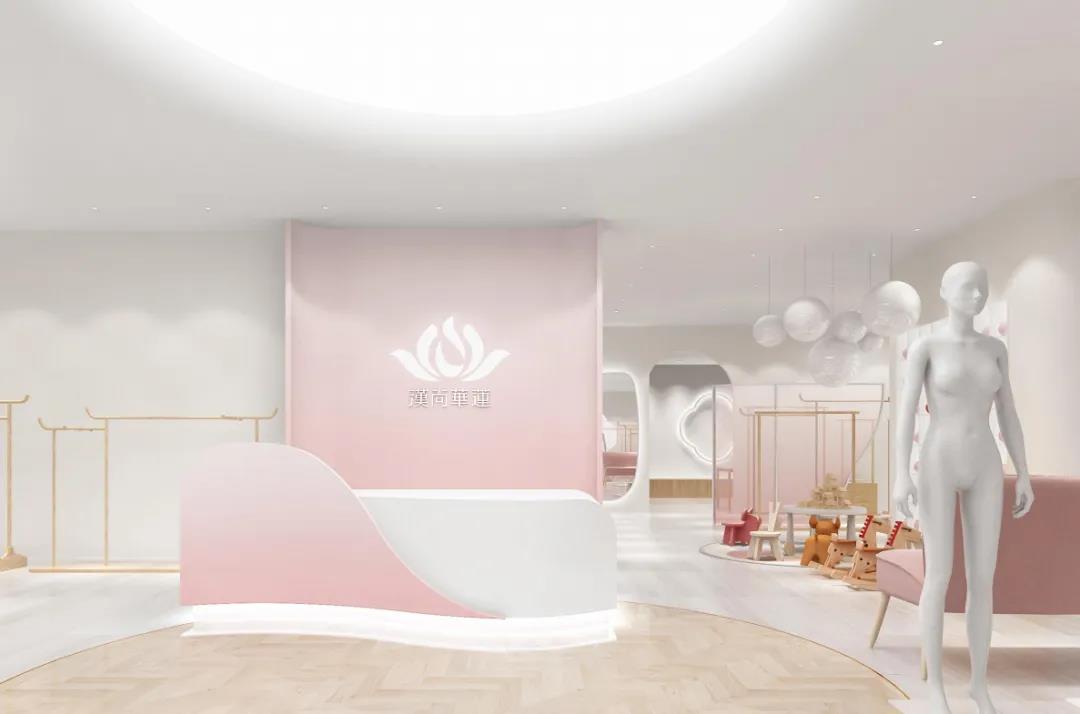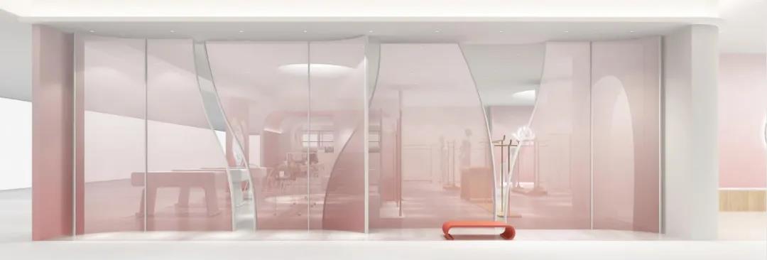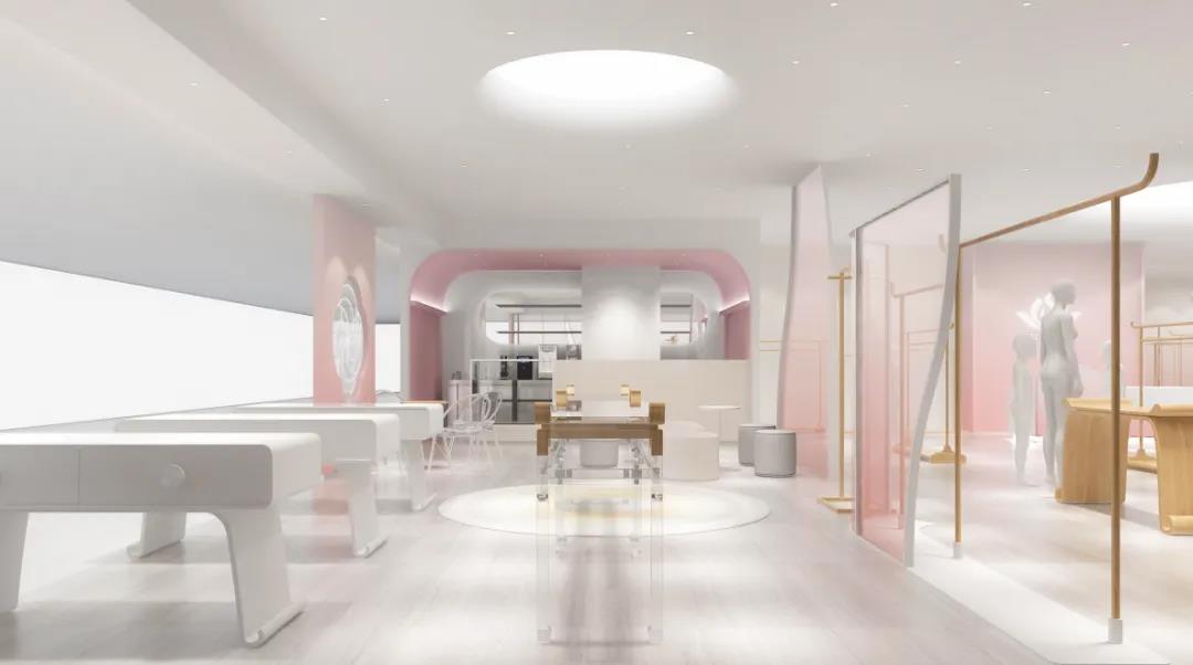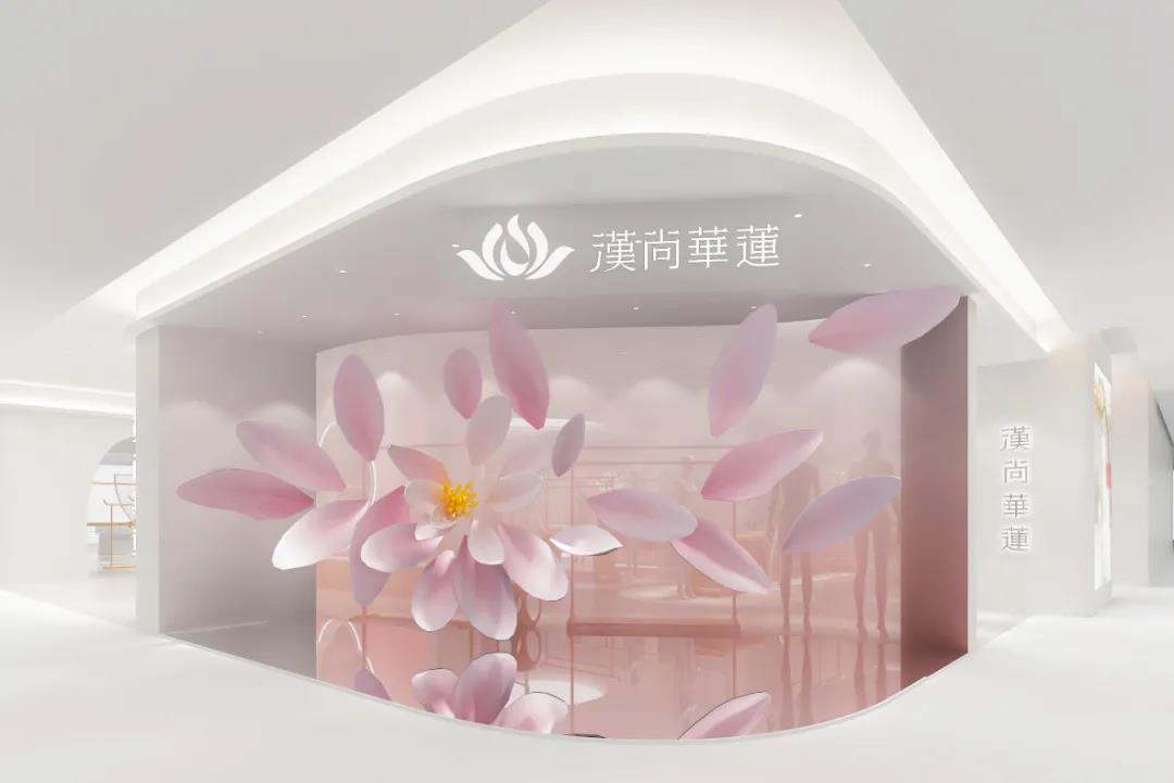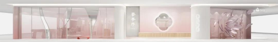 体验店以莲花的逐渐盛放之势作为设计理念创作采用大面积中国传统色——水红,鱼肚白作为主体色在流动的视觉盛宴中演绎国风美学的空灵诗意