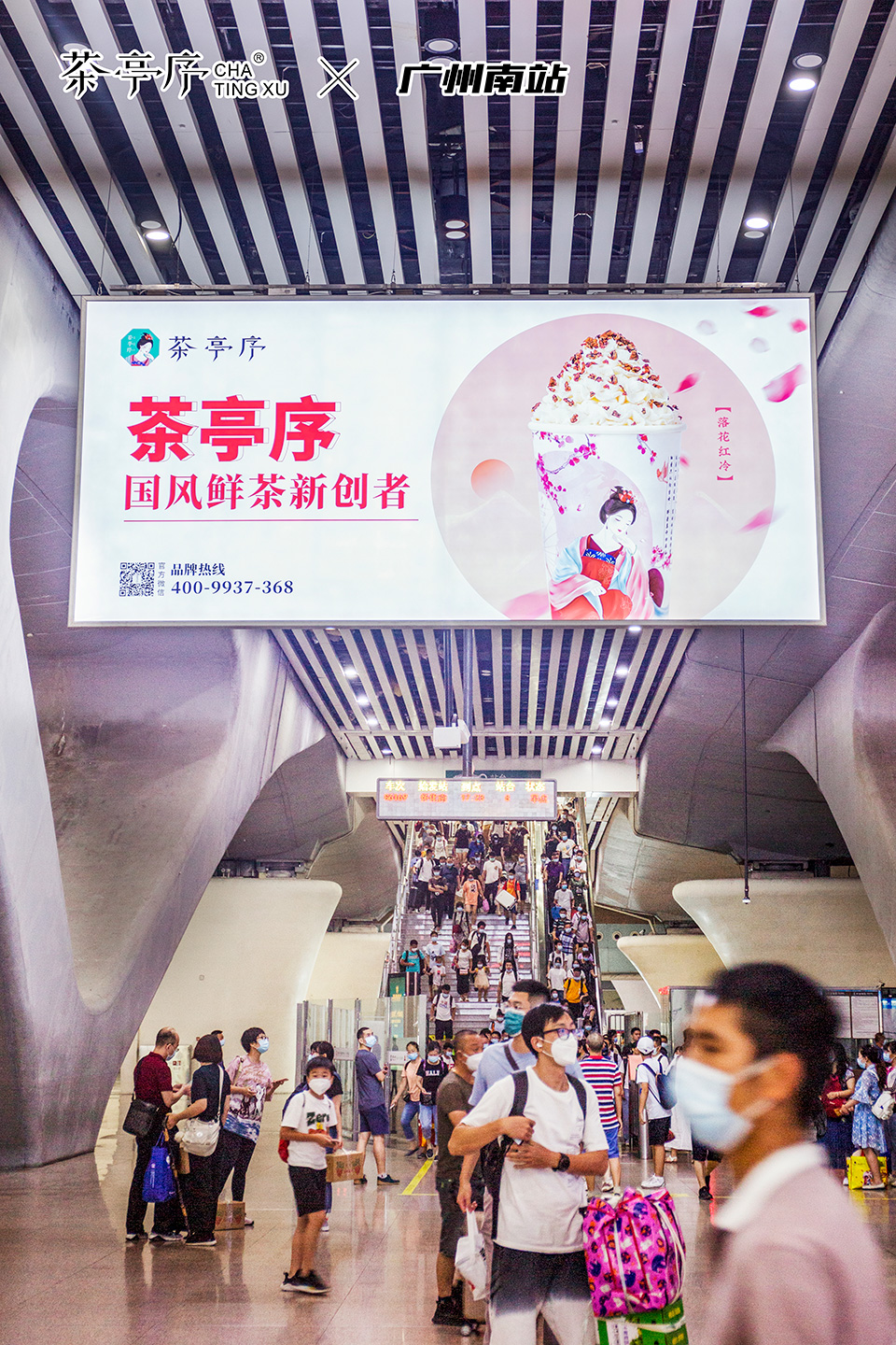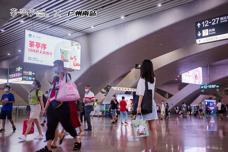 茶亭序在南站到达厅设置了巨大的吊幅灯箱,全面覆盖庞大的客流量,可实现100%出站人群覆盖、第一眼强制视觉,以更具触达率的媒体形式促成与商旅人群的密集沟通,进一步占据茶亭序品牌流动的主传播阵地,达到高密度、高频次曝光。